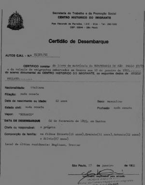 Desembarcando em Santos no dia dois de fevereiro de 1893, Ângelo Giuseppe Bellato e seus filhos vieram de trem pela serra de Santos até São Paulo, onde se alojaram na HOSPEDARIA SÃO PAULO, conforme registro número 37/73.